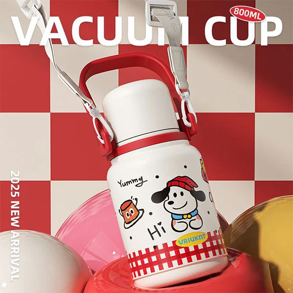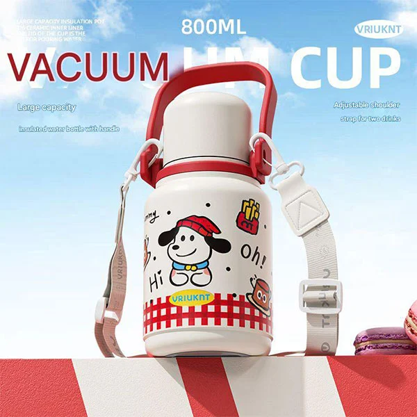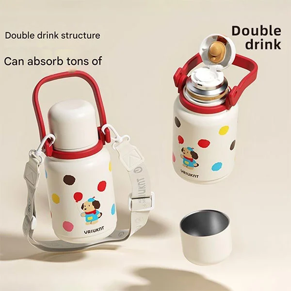 डिशवाशर सुरक्षित भ्याकुम फ्लास्क ठूलो ह्यान्डलको साथ आउँछ र काँधको स्ट्र्यापको साथ आउँछ, बालबालिका वा वयस्कहरूलाई तिनीहरूको हात उठाउन र खाली गर्न उपयुक्त हुन्छ। ढक्कनले पानीको कपको रूपमा पनि काम गर्न सक्छ